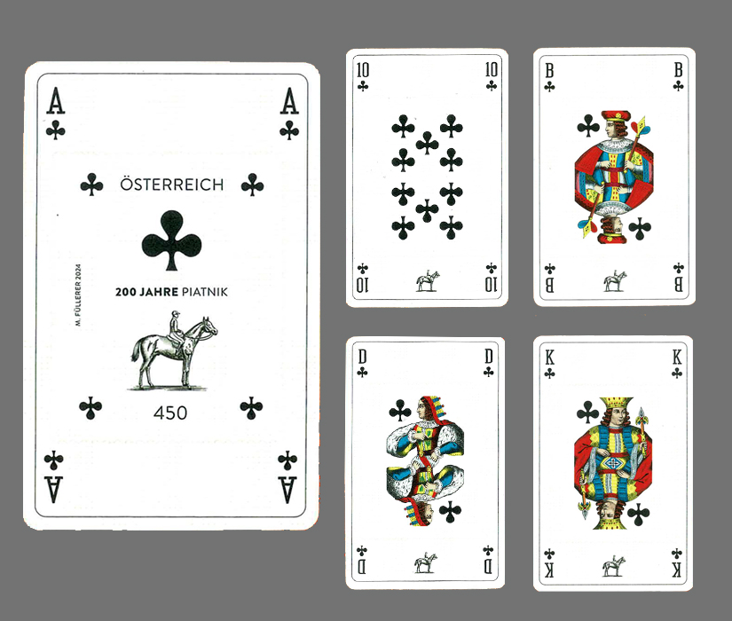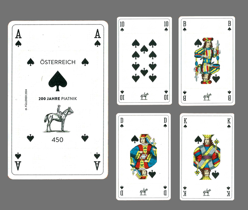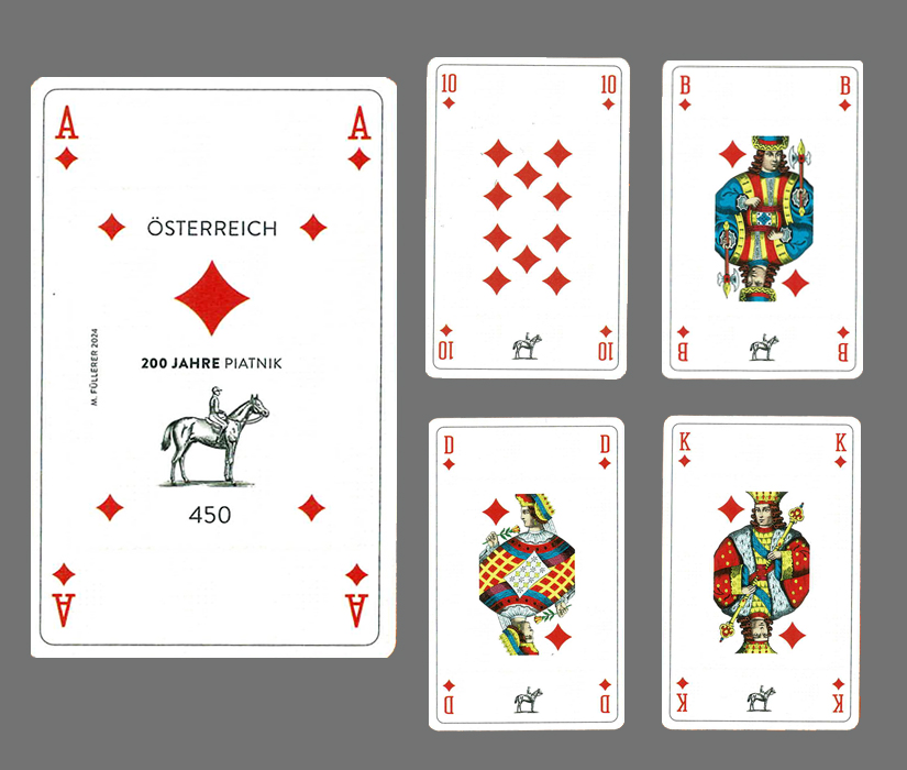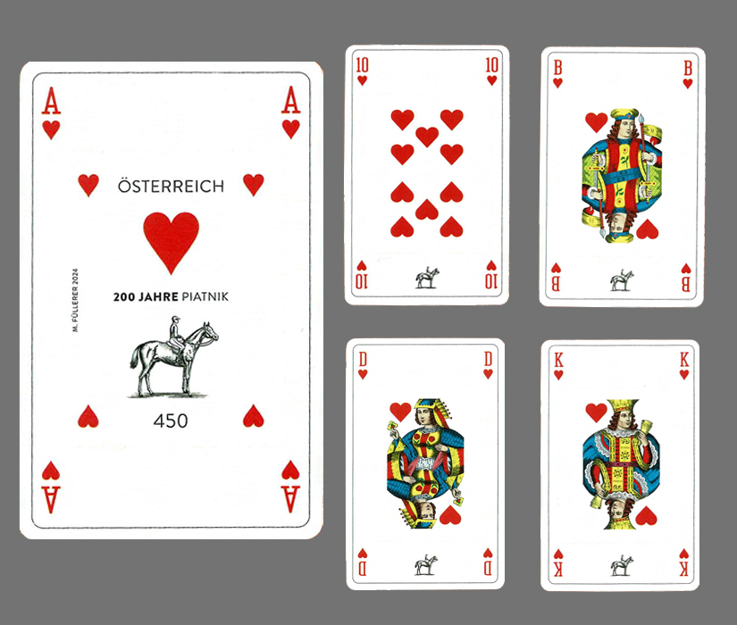 合計で20枚のカード(その中、郵便切手は4枚)が揃っているのは何故なのでしょうか? これはオーストリアで人気のある二人遊びのトランプ・ゲーム-「シュナプセン」(Schnapsen)で使う20枚なのです。