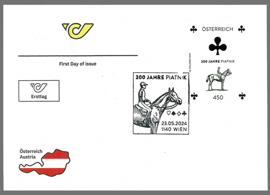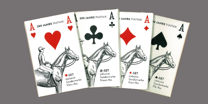 オーストリア帝国時代に創業の老舗トランプメーカー・ピアトニック(PIATNIK)社の、創立200周年を記念して発行された切手です。薄いプラスチック製で、ダブルインデックスの4枚のエースの中央には、同社のロゴである乗馬姿の騎手が描かれています。創業者と二代目が熱心な競馬ファンだったことから、1891年からこのロゴが導入されました。